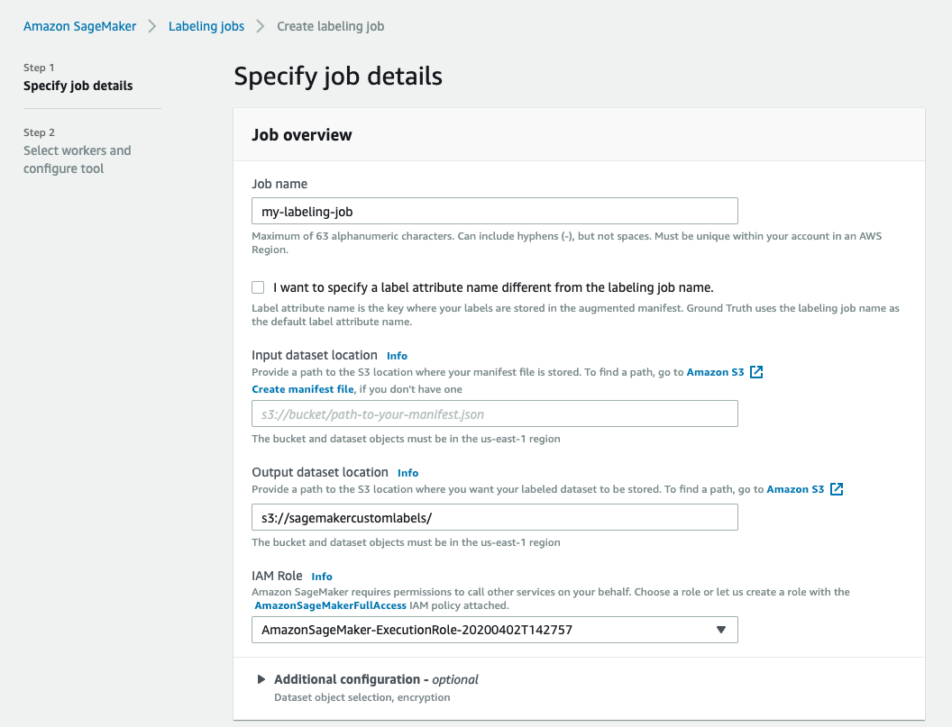 Put in details such as job name, input dataset location, output dataset location, and IAM Role