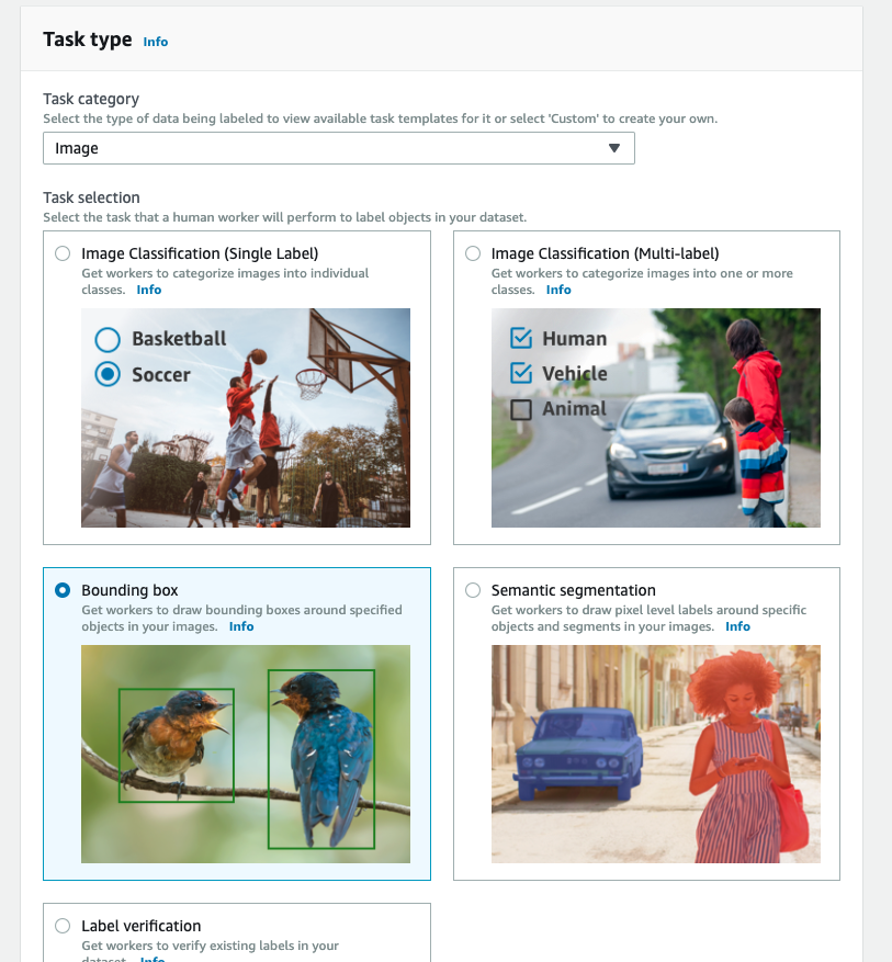 Continuing on the same page, select “Image” under Task category and select “Bounding box” under Task selection. Click Next.