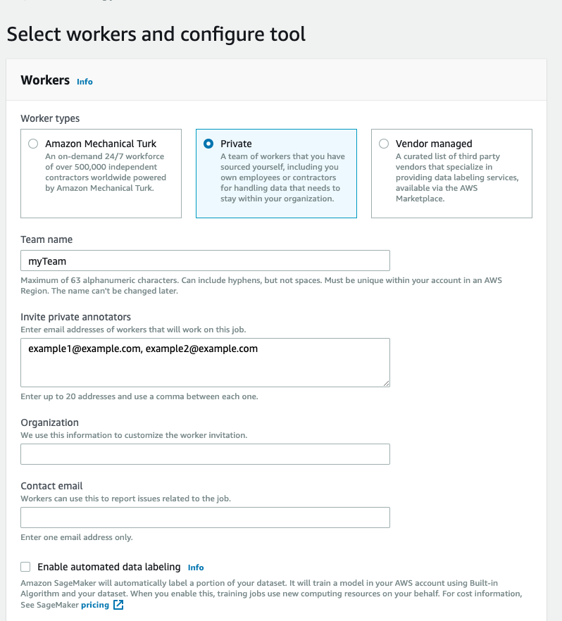 Ground Truth allows multiple worker types (mechanical turk, private, vendor managed). In this example, we will use “Private” workers. Fill in the appropriate details.