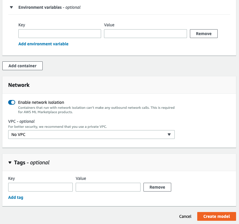 In the create model section, add model name and verify the auto-populated details. Click on “Create model”.