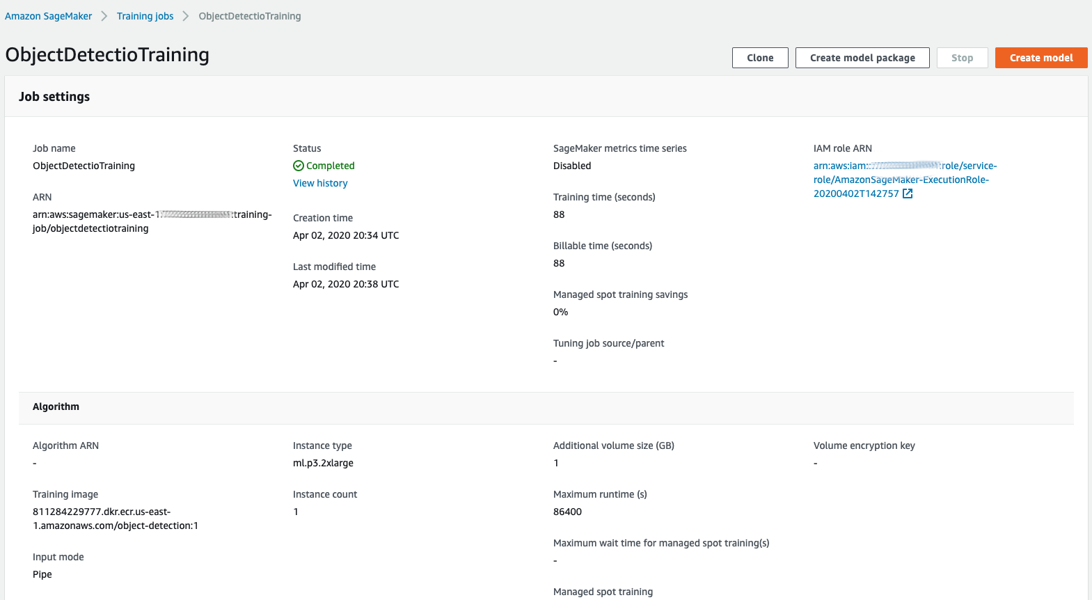 Once the training job is finished successfully, you will see the status as “Completed”. We will use the output artifacts to create a deployable model, click on “Create model”.