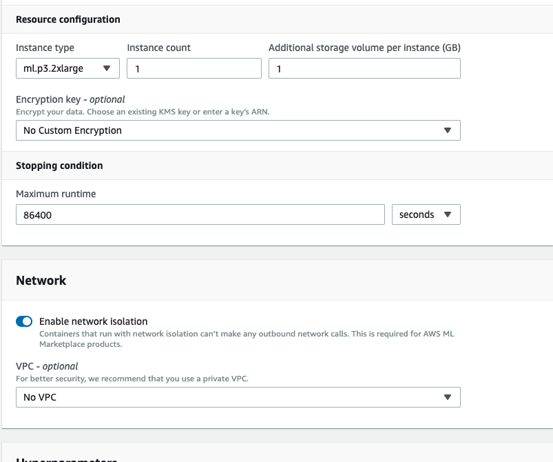 Continuing on training job details, put appropriate instance type and maximum runtime.