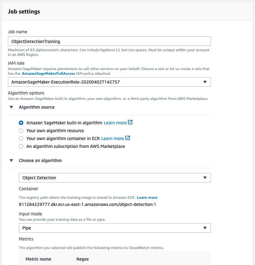 In the job details, add the job name, create a new IAM role or use an existing role which has necessary permission. Select “Object Detection” algorithm from the drop down and use “Pipe” as the Input mode.