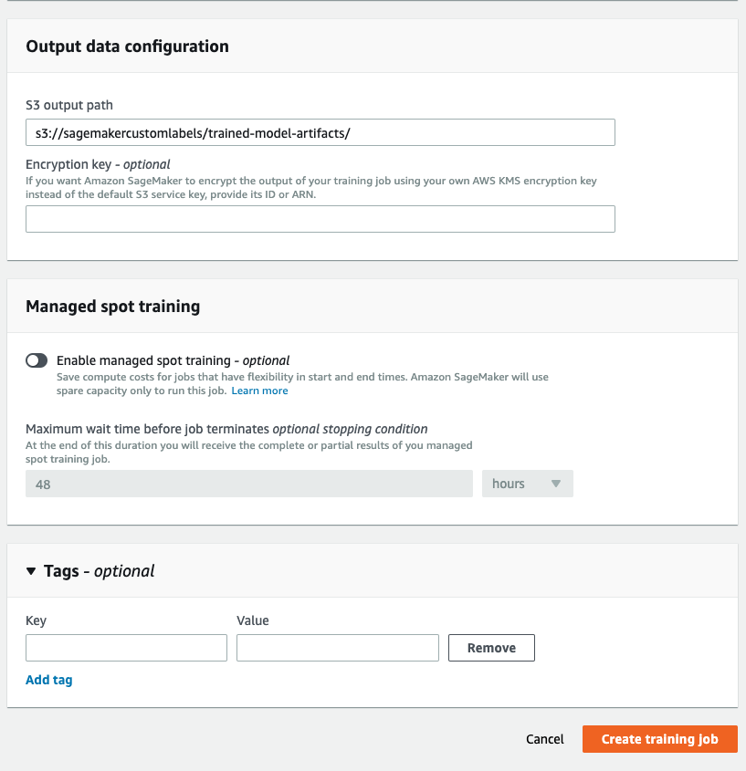 At last, specify the S3 path to save output model artifacts. Click on “Create training job”